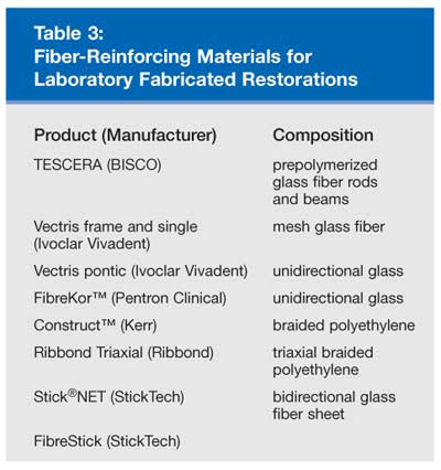 The majority of commercially available fiber-reinforcing materials are made from either UHMWPE fiber woven into either a biaxial braid or triaxial braided fabric ribbon or a lock-stitch leno-weave ribbon, or glass fibers that are either pre-impregnated with resin (as either a woven fabric or ribbon or as bundled unidirectional fibers) or non-resin impregnated (as a braided biaxial weave or rope that has been silane-treated for resin wetting). Whichever fiber-reinforcing material is chosen, it should be easy to use intraorally in whatever clinical condition is being treated. Clinical research supports using these materials as long-term provisional restorations; they should provide 5 to 10 years of service with some need for composite resin repair and resurfacing. Correct patient selection and proper treatment planning will ensure success with fiber-reinforcing materials.