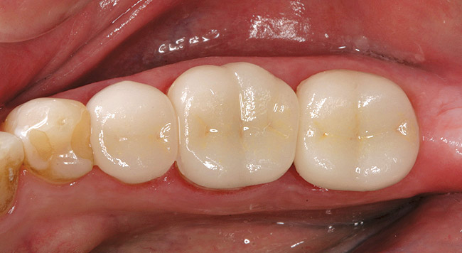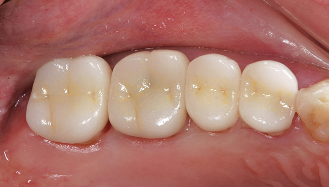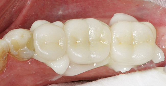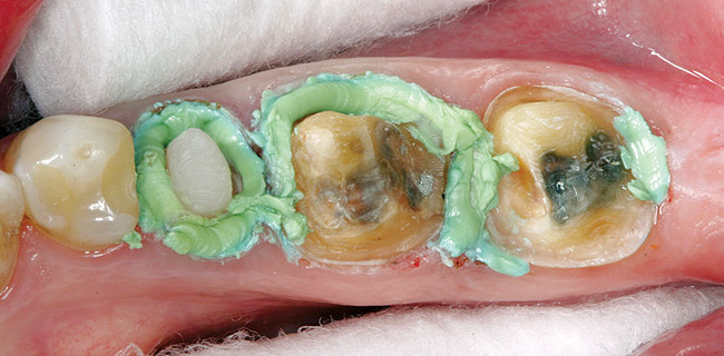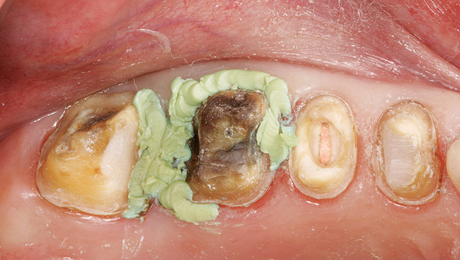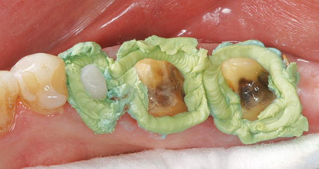 All decay was removed from the teeth and any necessary buildups were placed to eliminate undercuts or gain proper retention form in the resulting preparations. Before the optical scanning of the preparations for restoration design, the soft tissue was retracted in the subgingival areas with a putty-type retraction system (Figure 5');" rel="imagepop" rem="#ip:figure4 and Figure 5">Figure 4 and Figure 5). A putty retraction system was specifically chosen over traditional retraction cord or other hemostatic agent because of these two methods' potential for tissue (epithelial attachment) damage and recession.15-17