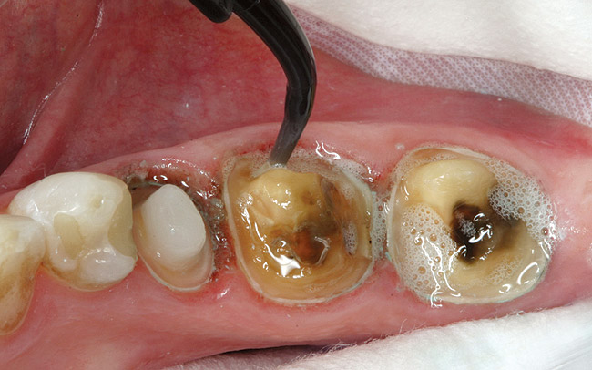 A preoperative impression was taken to assist in the fabrication of the provisionals. An alginate alternative was used because of its ease of use and dimensional stability over time as compared with traditional powder alginate (Figure 3).6 The teeth were covered with a talc-like powder (which functions as a contrast medium for taking the optical impressions) and the preoperative virtual impressions were taken. The existing restorations were removed and the presence of decay was verified with a caries detector and a spoon excavator.