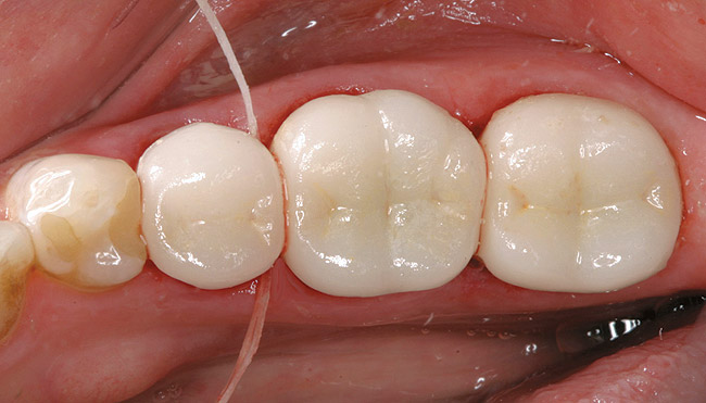 Tissue management was then obtained by the application of the same putty-type retraction system (Figure 8). After 2 minutes, the putty retraction material was thoroughly rinsed away with air/water spray and dried. The teeth were then cleaned again with 2% chlorhexidine, rinsed, and dried without reaching desiccation.20 The restorations were filled with a dual-cure resin cement system, Maxcem™ (Kerr Corporation, Orange, CA), seated, and remained undisturbed for 90 seconds before light-curing (Figure 9).6 This waiting period was mandatory for the self-adhesive chemistry in the cement to be fully effected. The cement reached a gel state and was easily removed with a handscaler (Figure 10). To ensure no movement of the restorations while cleaning cement interproximally, the restorations were tacked down mid-cervically on the buccal with a 4-mm turbo tip in a LED curing light. Interproximal cleaning was accomplished with waxed floss (Figure 11) and final curing was performed on both the buccal and lingual aspects with two LED lights simultaneously for 20 seconds (Figure 12), followed by occlusal curing for 20 seconds. Marginal finishing was performed with an 8-fluted carbide bur and composite points and cups. Interproximal finishing involved using medium- and fine-composite finishing strips. Occlusion was checked and slight adjustments were performed before the final polishing of these areas with porcelain polishing points. The final results are shown in Figure 13 and Figure 14.