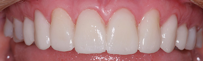 The end result was an esthetic and functionally contoured restoration in harmony with the patient’s envelope of function. And, most importantly, this functional solution has lasted the test of time. Figure 5 is a 90-month follow-up, which shows no loss of contour or de-bonding and no failure of the bonding of tooth No. 7 during this period.