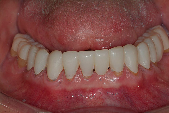 A problem with all matrixes is that the resin may not exit rapidly enough to prevent being trapped when the matrix is seated. This trapped resin prevents complete seating and will introduce error to the provisionals. Routinely, these provisionals will be high in occlusion and must be aggressively adjusted. These adjustments can destroy the precision of the work done in the laboratory. A possible solution is to create deep escape vents in the matrix beyond the free gingival margin (Figure 16). Multiple vents are required in a full-arch provisional. This allows an easy escape for the excess resin and allows more ideal positioning. Dentists may verify seating by evaluating the thickness of resin captured on the palate in the maxilla or on the tooth stops in the mandible (Figure 17 and Figure 18). If an excess amount of acrylic remains, then the provisional is high and the vertical dimension and occlusion of the wax-up have not been transferred. Rather than grinding resin haphazardly, the provisional should be remade with more vents cut to improve seating.