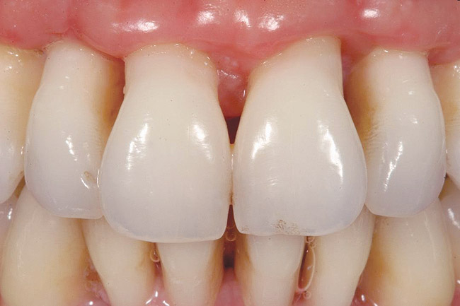 It is usually desirable to maintain shallow rather than deep probing depths around teeth for multiple reasons: shallow depths facilitate supragingival hygiene, which impacts the subgingival microflora; there is less bleeding on probing; at shallower sites it is easier to instrument root surfaces; there is less predisposition for disease progression; and shallow depths are better forecasters of periodontal stability.13 Pertinently, periodontal surgery is often done to reduce or eliminate deep probing depths.14 However, a usual consequence of periodontal surgery is recession of the gingiva and interdental papillae, which may create undesirable “black triangles” between teeth. Therefore, resective procedures that create an unesthetic gingival topography are contraindicated on teeth that have a questionable prognosis in the esthetic zone. In addition, surgical procedures may result in large interdental embrasures, which are plaque retentive and may cause increased thermal sensitivity (Figure 1).