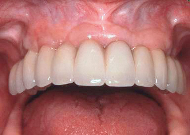 Six months after an extraction of maxillary anterior teeth, there is loss of bone ridge width (x = 4.56 mm) and height (x = 1.5 mm) if socket preservation techniques are not used (eg, bioabsorbable barrier).16 Most of the osseous resorption occurs during the first 3 months after tooth removal.17 This expected bone loss must be considered in light of the deterioration that already occurred because of periodontitis. Even immediate placement of implants into extraction sites does not prevent initial bone resorption from occurring.18 Subsequently, integrated implants provide stimulation to the alveolar bone and retard osseous resorption,19 whereas an edentulous ridge without implants continues to resorb if a removable prosthesis rests on the ridge.20,21