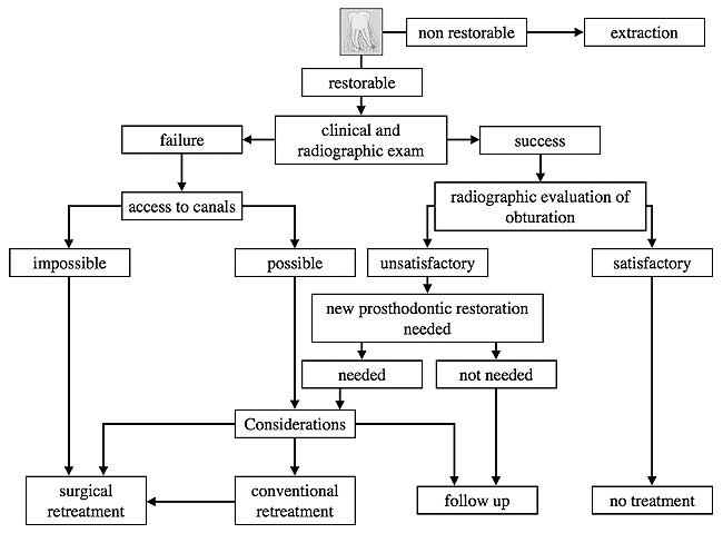 The treatment options for root canal treated teeth with a questionable outcome include a regular follow-up, conventional re-treatment, surgical re-treatment, or a combination of conventional and surgical re-treatment. Every treatment plan should be created individually, and several questions should be asked before making a decision. It is not necessary to re-treat because of an unsatisfactory appearance on the radiograph only. If the patient is asymptomatic, no new restoration is planned, and the periapical condition could be healing or scar tissue, a regular follow-up might be advised. However, it is important to understand the factors responsible for the failure of the initial therapy to select the necessary treatment.