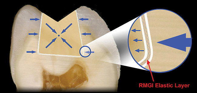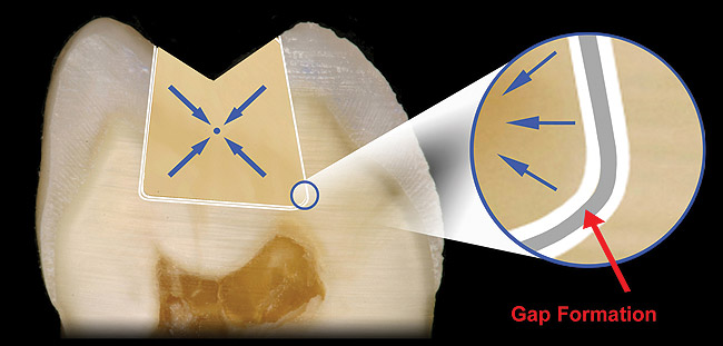 The second major consequence of polymerization shrinkage is the cusp deflection, or deformation, especially in cavities with a high “C” factor,9,10 which is believed to be one of the causes of postoperative sensitivity, especially related to chewing.11 Because of their low modulus of elasticity and dentin adhesion, liners can be used to counterbalance the cusp deformation (Figure 3).