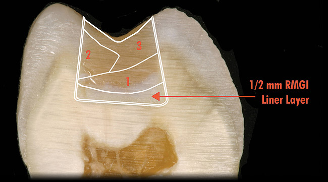 Additionally, placing the self-adhesive RMGI liner on the areas of deep dentin can protect this sensitive dentin from the strong conditioners needed for the subsequent bonding procedure. From the clinician’s standpoint, overcoming these problems translates into less postoperative sensitivity.
