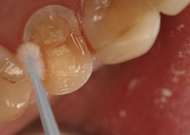 When the patient returns for the insertion, anesthesia is usually not necessary because of the fact that the dentin is already sealed. The temporary restoration is removed and the prepared surfaces are cleaned with either an acetone-soaked cotton pledget or phosphoric acid gel on a rotary brush or cup. It is important not to create any bleeding from the surrounding gingival tissue. The tooth is rinsed with water and air-dried. To refresh the bonding surface, apply a coat of Brush&Bond to the preparation for 20 seconds, air-thin for 10 seconds, and light-polymerize for the necessary time. The restoration can now be inserted with either a resin cement or a resin-modified glass-ionomer cement.