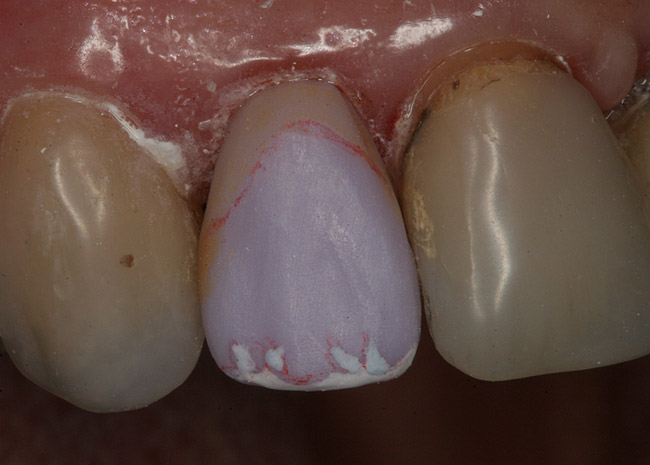 The crown was then tried in to evaluate the shade and the stain effect. The chroma of the crown was high in the red-yellow range, and had a high value (brightness) (Figure 16). It was necessary to equalize the red-yellow by neutralizing it with its complementary color (violet). Grey is the result when two complementary colors are mixed, which also reduces the value. An incisal stain, which is violet, was applied to the entire facial surface (Figure 17). The crown was then placed on a honeycomb firing tray and placed back into the porcelain oven and fired using the corrective firing program. After cooling, the crown was again tried in to verify the color change.