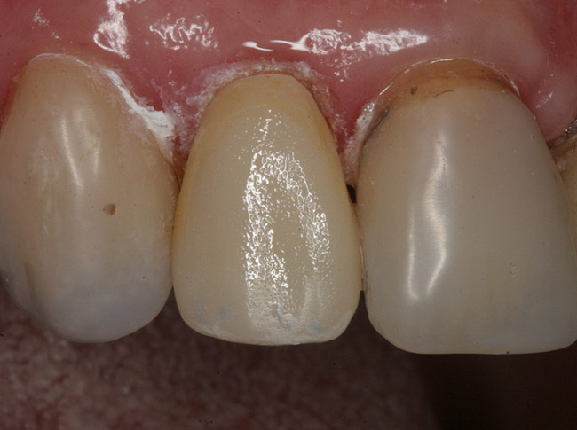 It is necessary with the CEREC® (Sirona Dental Systems) to lightly coat the prepared tooth with titanium dioxide to acquire an image using the acquisition camera. The prepared tooth was powdered and scanned. Using the CEREC software correlation program, a full-contour crown was designed and electronically sent to the milling device. A lithium disilicate was selected and milled. The crown was steam-cleaned to remove the milling surfactant. The remaining sprue attachment was removed with a green stone. A fine-diamond tapered bur was used to refine the final contour. Then, a ceramic polisher was used to produce the initial crown finish. The crown was then tried in to confirm the fit and occlusion.