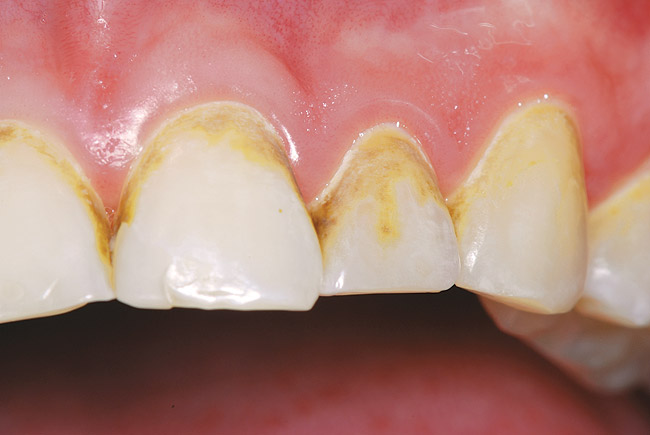 The cervical areas of all teeth showed severe staining of the enamel with no cavitations (Figure 1 through Figure 3). These areas had remineralized and the enamel surface, although not cavitated, did have a discolored and rough surface. Cigar smoking contributed to the severity of the staining. At the time the photographs were taken, the patient admitted to drinking one can of SSB per day (at most) and drank water throughout the day. He was using a prescription fluoride toothpaste daily and flossing. Erosion was minimal and visible on tooth No. 9 along the margins of Class IV composite resin (Figure 3).