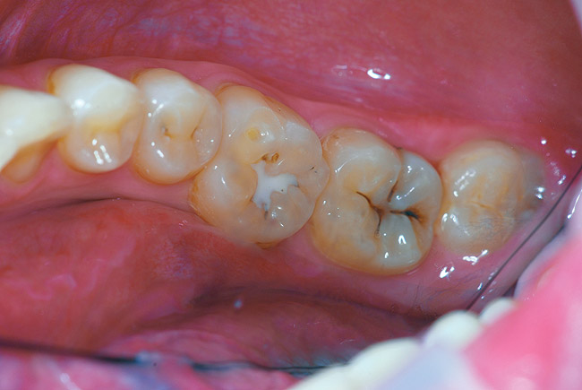 The treatment plan included restoration of the carious lesions on tooth No. 18 (Figure 4) and No. 31 (Figure 5) and removal of sealants on tooth Nos. 19 and 30 to determine if caries was present along the broken margins of the sealants. Recommendations for this patient included: daily usage of a prescription fluoride toothpaste, daily flossing, limitation of SSB consumption, drinking tap water for hydration, and cessation of smoking.