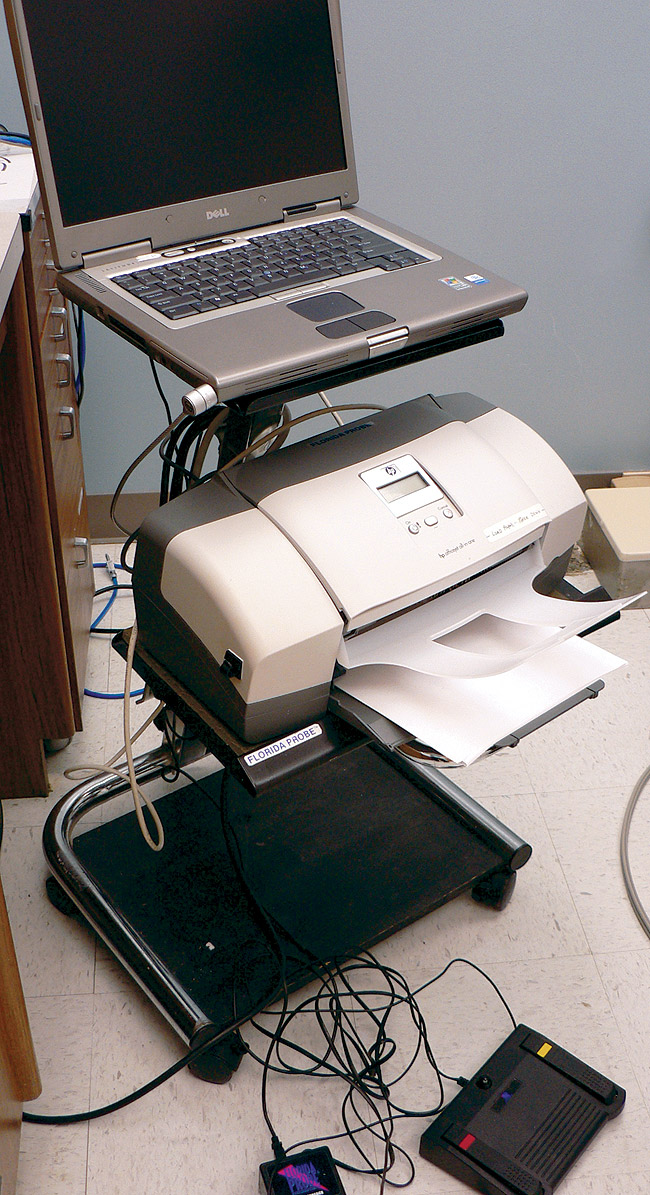 The controlled-force probe that has achieved the most widespread use is the Florida Probe® (Florida Probe Corp, Gainesville, FL) (Figure 5A and Figure 5B). This computer-linked device has in vitro resolution of 0.1 mm and is capable of recording probing depths and relative attachment levels.25-31 Clinical measurements obtained with conventional manual probes are consistently greater than those obtained with controlled-force probes.24,32-37 One of the possible reasons for this is reduced tactile sensitivity associated with the use of controlled-force probes. This is especially true in patients with untreated periodontitis for whom the presence of subgingival calculus can interfere with probe insertion. With conventional probes, it generally is easier for the operator to manipulate the probe tip past subgingival calculus deposits. A definite advantage of computer-linked probes is that they can record probe readings automatically. Some systems allow voice-activated data entry.38 The usefulness of controlled-force probes in day-to-day clinical practice has not yet been demonstrated.9