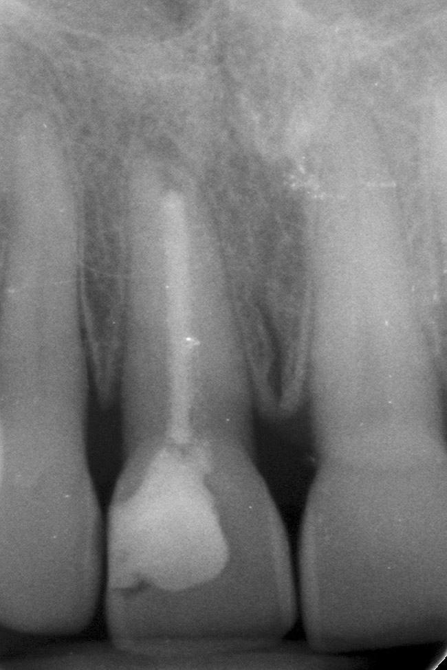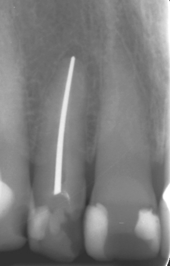 Pulp necrosis as evidenced by periapical radiolucency is an infrequent sequela to PCO occurring in approximately 7% to 16% of cases; consequently, prophylactic endodontic therapy is not recommended by most authors.28,39-41 Teeth with PCO likely have diminished healing capacity, and it is not well established whether a secondary trauma or additional dental treatment causes necrosis. In some instances, such as preparing a tooth with PCO for an abutment, it may be prudent to perform prophylactic endodontic therapy before the definitive restorative procedure. A recent article by daCunha and colleagues suggests implementing endodontic therapy prior to development of a periapical radiolucency in a tooth with PCO, based on two major considerations: (1) the technical difficulty and complications that may occur in treating these teeth; and (2) their review of a study that demonstrated a 97.9% success rate for teeth treated without periapical radiolucencies vs a 62.5% success rate for teeth treated with periapical radiolucencies.42 Specific clinical situations will dictate clinical decisions; however, given the relatively low incidence of pulp necrosis in teeth with PCO, endodontic treatment usually is not recommended in the absence of a periapical radiolucency or symptoms. Nonetheless, if a periapical lesion develops, endodontic therapy can be both challenging and fraught with complications (Figure 4). The use of operatory microscopes in the hands of a skilled clinician is warranted and improves the chances of a successful outcome.