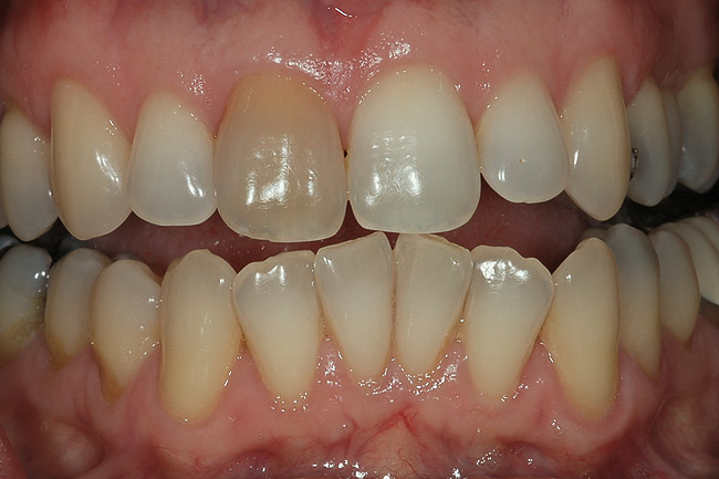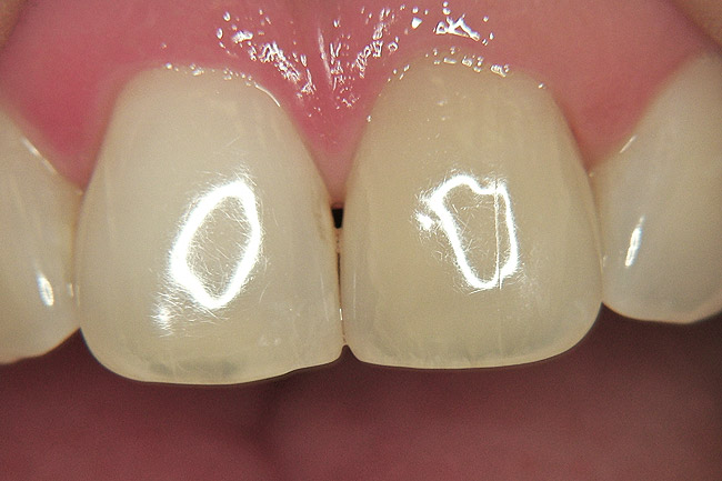 There are a number of types of bleaching techniques to consider for both vital and non-vital teeth, but these types may be divided mainly into those performed in-office or those continued at home. With the advent of nightguard vital bleaching involving tray application of 10% carbamide peroxide, a method for bleaching single dark teeth became more readily available, and did not involve the use of highly caustic chemicals.43 The original recommendation for a single dark tooth was to make a non-scalloped, no-reservoir tray, and bleach all the teeth. The tooth that was darker generally took longer, so an “X” was made on that tooth mold of the tray so the patient could continue to bleach that tooth longer than the other teeth. The use of the “X” on the teeth to be bleached was also helpful when the patient already had crowns on some teeth, and placing bleaching material on them was a waste of material. While this tray system was simple and effective, it did not always result in a perfect match of the teeth. All the teeth would lighten, but often the darker tooth was not able to lighten as much as the normal teeth, and the resultant outcome was lighter teeth, but still with one tooth slightly darker than the others. Some authors have recommended using a reservoir on the darker tooth, but the use of reservoirs has not been shown to increase bleaching efficacy.44 It is not possible to “spot bleach” a tooth either, because the bleaching material goes through the enamel and dentin to the pulp in 5 to 15 minutes, and bleaches under restorations and from one surface to the other (facial to lingual). It has also been shown to bleach beyond the borders of the tray, generally to the cementoenamel junction (CEJ), even if the tooth is only partially erupted.