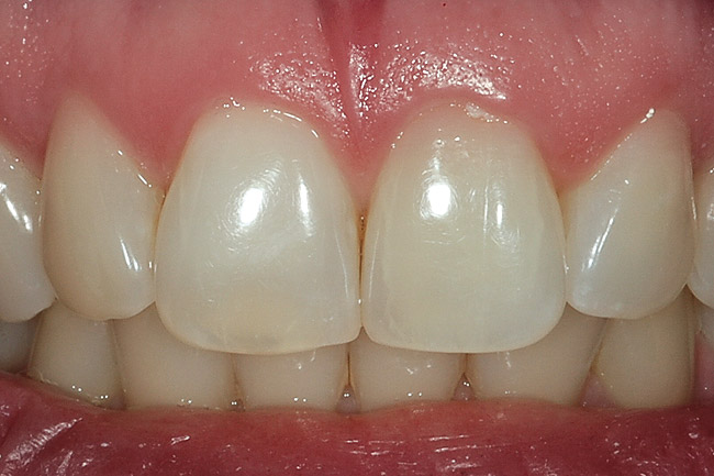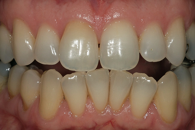 Endodontically treated teeth may be treated from the inside, the outside, or both. The decision for inside or outside depends on a knowledge of what has occurred inside the tooth during the endodontic therapy, as well as the type of restoration used to seal the access opening. The tooth may have received a satisfactory endodontic treatment and been subsequently restored with an acceptable lingual composite that matched the tooth color. However, in subsequent years, the tooth may have discolored (Figure 10). In this situation, the decision for bleaching favors external bleaching, because going inside the tooth to remove the composite will weaken the tooth (Figure 11). However, the choice not to go inside the endodontic tooth depends on whether the treating dentist is aware of the extent to which the pulp chamber was debrided during endodontic therapy, as well as the height in the chamber of the cement and filler.