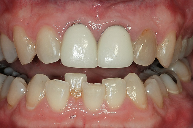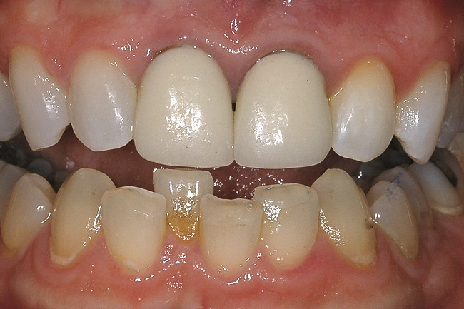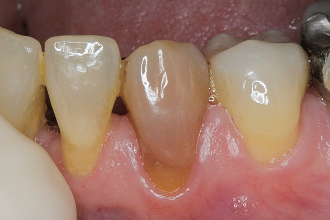 Additional considerations for the single dark tooth are the color of the gingival tissues around the tooth, as well as whether there is any root structure visible due to recession. A smile analysis is used to determine these conditions as well as the movement of the lip during smiling and whether a “gummy smile” exists. The dentin in the root is different from the dentin in the anatomic crown, and does not bleach well if at all, regardless of whether internal or external bleaching is attempted. Also, discolorations of the gingiva may cause a tooth that may be a perfect color match to not be harmonious. Either of these conditions is magnified if the lip exposes much of the root or gingiva because of a hyperactive lip or gummy smile.