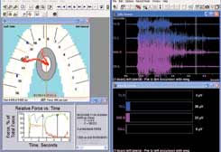 Figure 4 Preadjustment snapshot from the T-Scan/BioEMG Link software. This snapshot also shows the preadjustment state of the patient, but later in the excursive path than Figure 3. Note that there was still tooth contact on the left side in addition to the canine area (tooth No. 11) in the upper-left window. The upper- and lower-right windows showed the continued and delayed elevator muscle activity associated with this additional contact as the patient continued to move into her left lateral excursive. (Case file used with permission, Robert B. Kerstein, DMD, Boston, MA.) | Figure 5 Postadjustment snapshot from the T-Scan/BioEMG Link software. This snapshot was produced at approximately the same timeframe after the excursive began as in Figure 3. Note the differences between views 3 and 5: The lower-left window in Figure 5 showed the time it took for the patient to perform the excursive maneuver was reduced from 1.296 seconds to 0.274 seconds. The upper- and lower-right windows showed that at the same time interval after initiating the excursive, the muscles were shutting down far more quickly and more completely than in Figure 3. (Case file used with permission, Robert B. Kerstein, DMD, Boston, MA.) |