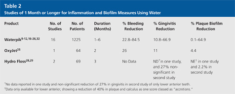 Other studies confirm that bacterial cells exposed to pulsed irrigation produced less tissue-based mediators of inflammation. Al-Mubarak et al11 showed that patients who used twice-daily irrigation had significantly better reductions in serum measures of interleukin-1-beta (IL-1b‚) and prostaglandin E2 (PGE2) at 12 weeks. Cutler et al12 showed that daily water irrigation significantly reduced gingival crevicular levels of the proinflammatory mediators IL-1b‚ and PGE2 associated with attachment and alveolar bone loss.