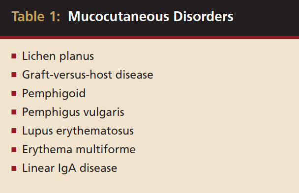 Surgeons may be faced with providing periodontal plastic or implant therapy to patients with gingival manifestation of systemic conditions. These conditions often present with features of desquamative gingivitis (DG), which was once believed to represent a disease entity. However, today, DG is used to describe clinical features of various local or systemic diseases or disorders that result in chronic gingival lesions characterized by epithelial desquamation, erythema, ulceration, and/or vesiculobullous lesions of the gingiva. Often, other oral tissues also are involved.1 Mucocutaneous disorders include such disease entities as lichen planus, graft-versus-host disease (GVHD), pemphigoid, pemphigus vulgaris (PV), lupus erythematosus (LE), erythema multiforme, and linear IgA disease (LAD) (Table 1). Surgeons should be able to recognize these disorders and possess the tools necessary to treat these disorders so that they can render the appropriate surgical care.