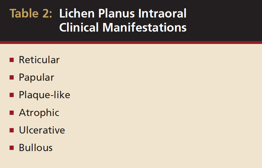 Today, however, there is a trend toward consolidating the types of OLP into the reticular (reticular, papular, plaque-like), erythematous (atrophic), and erosive (ulcerative, bullous) forms7 (Figure 3 and Table 2). Some have limited the forms to reticular (reticular, plaque-like) and erosive (atrophic, bullous, and ulcerative).12 Variations in terminology make it important to define terms when discussing the types of OLP with other healthcare providers regarding shared patients.
