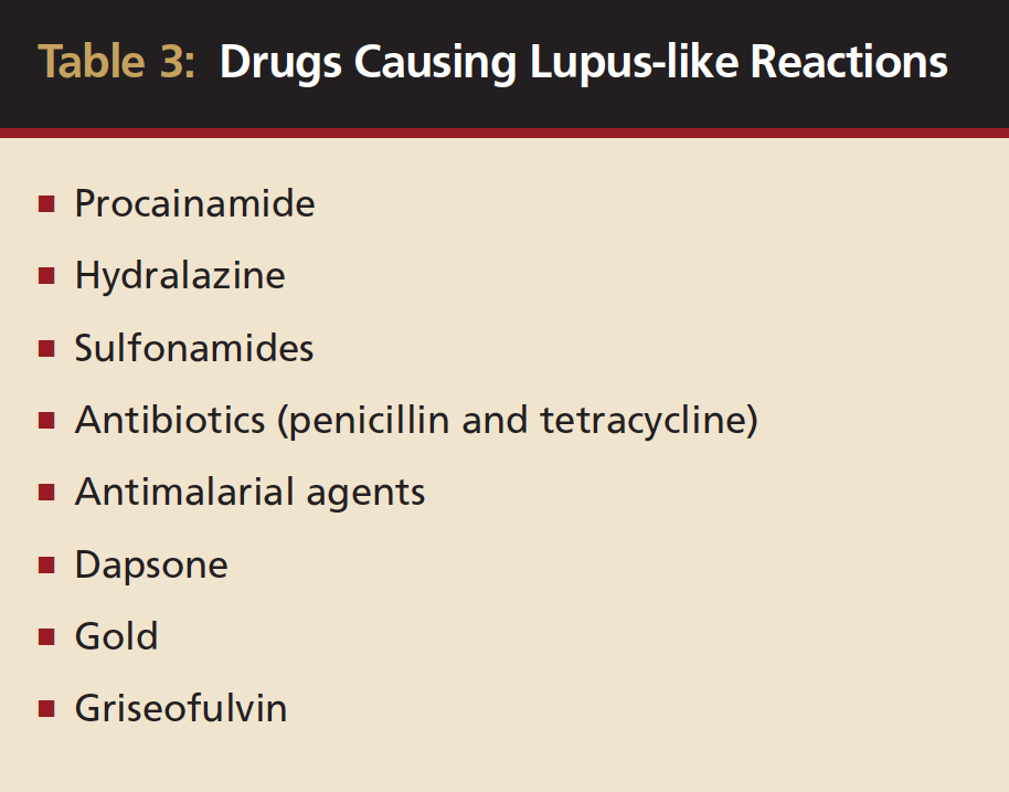 Outbreak of lupus lesions may be triggered by infections, elevated temperature, concurrent systemic diseases, and exposure to ultraviolet light or drugs. Many drugs have been indicted as precipitating an outbreak; however, the most common include procainamide, hydralazine, sulfonamides, antibiotics (penicillin and tetracycline), antimalarial agents, Dapsone, gold, and griseofulvin (Table 3). Ironically, the latter four drugs and medication groups often are used to treat other mucocutaneous diseases.70