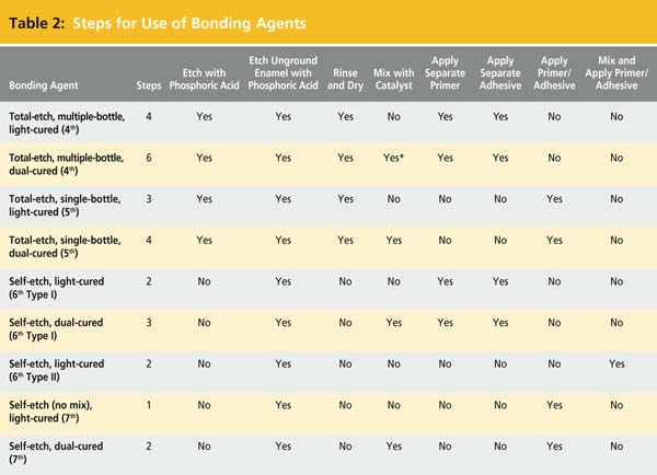 The 7th-generation systems—the newest to the market—were introduced in the mid 2000s. Using a single-bottle system, these last two types of the nine types of bonding agents require the fewest number of steps, and are available in either light-cured or dual-cured setting types (Table 1).
