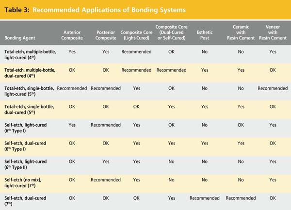 Each generation is recommended for a specific clinical application: 4th-generation systems are considered best for composite cores; 5th-generation systems are ideal for bonding of anterior and posterior composites and cementation of veneers with resin cements; 6th-generation bonding agents are recommended for bonding of posterior composites; light-cured 7th-generation bonding agents are ideal for bonding of posterior composites; and dual-cured 7th-generation bonding agents are suggested for bonding of esthetic posts and ceramic restorations with resin cement (Table 3).3