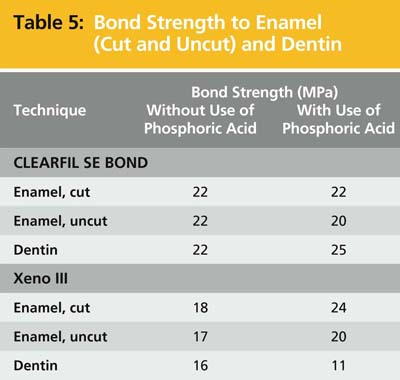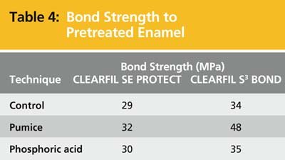 With uncut enamel, two techniques could be used to remove the enamel pellicle and prepare it for bonding: the pumice technique and the pre-etch method. Pumice can be used on uncut enamel to improve the bond strength by 3 MPa to 14 MPa, depending on the bonding product used (Table 4).12 In the pre-etch technique, phosphoric acid is applied to enamel before tooth preparation. This approach eliminates the need to etch uncut enamel and avoids possible contamination of dentin with phosphoric acid. Both techniques are effective on unrestored teeth, as well as on teeth with old amalgams that need replacement.