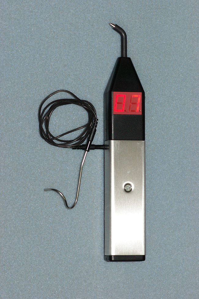 The Digitest (Figure 2) is a handheld, ergonomically designed instrument that has been designed using integrated circuitry that generates a complex, pulsed waveform. A weak, controlled current repeats several times a second. This waveform allows for a more controlled assessment of large-diameter nerve fibers (A delta fibers) within the odontoblastic processes so the patient perceives the stimuli below the pain threshold. The gradual controlled, gradual increase in the electrical stimulation is restricted by the microprocessor in order to prevent any jump in stimulus that can trigger a painful response. A patient will report a mild sensation for a vital tooth with a significant time lag before a patient experiences discomfort. The device is powered by a standard, user-replacable, preinstalled 9-volt battery. Unlike other EPT devices, the practitioner has several methods for grounding the unit to complete the electric circuit. The patient can either touch the handle of the Digitest instrument with a finger. Or the circuit can be completed using a ground wire with a lip-shaped hanger attached to the instrument so it can be placed gently, cradled on the patient’s lip. The device also has two different lengths of autoclavable EPT tooth probes (Figure 3). Both the lip-grounding wire and EPT probes can be sterilized in a conventional steam autoclave. The Digitest device should not be autoclaved but should be cleaned with a cloth or paper towel dampened with a surface disinfectant.