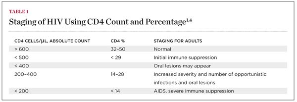 CD4 cells are a subset of lymphocytes, or T-cells, and are particularly susceptible to destruction by HIV. The number of CD4 cells is reported as part of a list of several types of lymphocytes and used in HIV staging (Table 1).4 The value is usually reported as an absolute count, as well as a percentage of total lymphocytes. The absolute CD4 count per microliter (µL) is most often the index used in clinical practice, while the percentage is employed to assess immune function. Cluster of deviation 8 (CD8) cells, also called cytotoxic T cells, are no longer used to predict clinical outcomes, although they are still reported in many tests.1,3