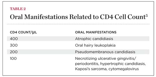 The CD4 count also helps to determine the need for and response to antiretroviral therapy. Oral manifestations have been correlated to CD4 counts (Table 2). If the dental healthcare provider observes certain oral lesions, the physician should be notified that the HIV may be progressing and a change in medications may be indicated.5