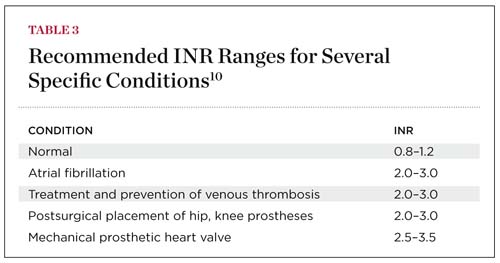 The international normalized ratio (INR) is the standard test used to measure the therapeutic level of anticoagulation with warfarin therapy. It was endorsed by the World Health Organization in the 1980s9 to facilitate comparisons of PTRs from one region of the world to another. This allowed physicians to collaborate on the best therapy for specific conditions. Recommendations have been published that give guidance based on the condition being managed10 (Table 3).