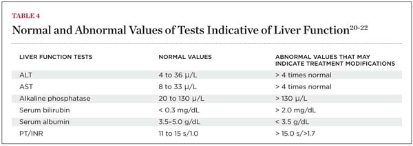 Perhaps the most important liver functions to dental healthcare providers are drug metabolization and production of clotting factors. The evaluation of overall liver function is accomplished using a group of tests related to its functions (Table 4). Abnormal test results may indicate significantly impaired hemostasis (due to the lack of sufficient coagulation factors) and/or impaired detoxification or activation of medications that may be prescribed during dental treatment.
