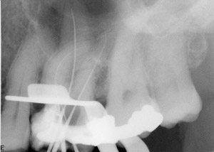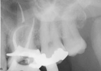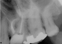 Figure 4 Postoperative radiograph showing successful root canal. | Figure 5 Master-cone radiograph depicting mesial and distal roots, prior to obturation. | Figure 6 Another radiograph after downpack of palatal canal. |