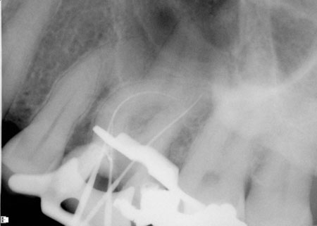 In the following case, the author used several of the above suggestions to properly determine working length. This tooth was diagnosed with irreversible pulpitis, and multiple visits were required to complete the case. While the maxillary sinus and zygoma often interfered in the author’s interpretation of the tooth’s anatomy, the tooth’s anatomy itself proved to be the largest obstacle to performing ideal root canal therapy (Figure 1). Originally, a periapical radiograph was taken to determine if the mesial canals actually curved as severely as the hand files had indicated. A periapical radiograph was then taken to approximate the measurements (Figure 2). Just from his own tactile sensation, the author came close to approximating the proper length of the canals but was not entirely accurate.
