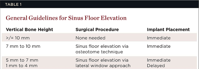 Various treatments for implant placement in the compromised posterior maxilla are available (Table 1).8 Among these are the placement of shorter implants, placement of tilted implants mesially or distally to the sinus cavity, elongated zygomatic implants in the lateral part of the zygomatic bone, and sinus floor elevation with a one-stage technique using a transalveolar approach (osteotome method), two-stage approach using osteotomes, a one-stage technique using a LW approach, or a two-stage technique with a LW approach, followed by implant placement after a healing period.