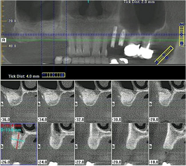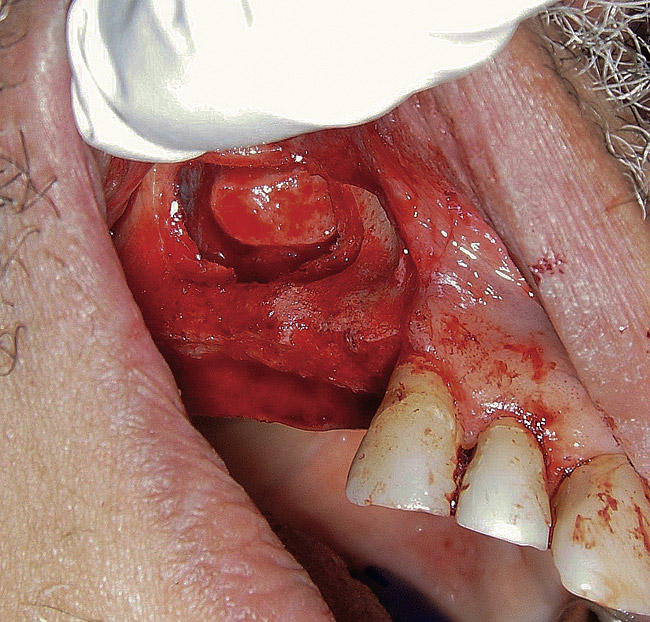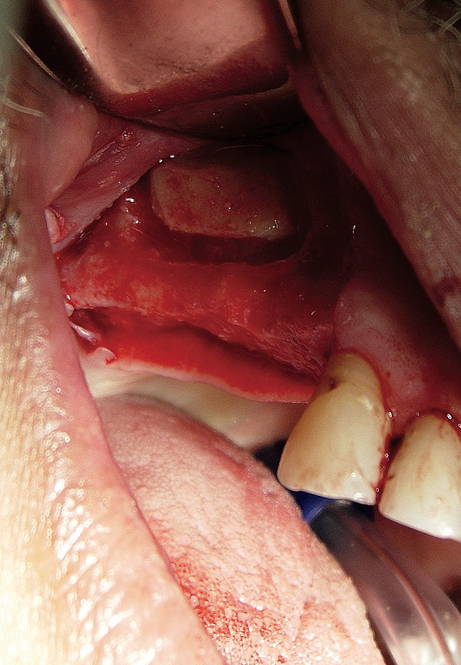 The lateral approach is also used for sinus floor elevation. It is indicated when there is reduced residual bone height, which does not allow standard implant placement or placement of implants in combination with minor sinus floor elevation using the osteotome technique (Figure 1, Figure 2 and Figure 3). Contraindications are excessive interarch distance due to unfavorable crown-to-root ratio, acute or chronic unresolved sinusitis, current sinus pathology (eg, cysts or tumors), lodged root tips in the sinus, history of heavy smoking, a systemic compromise, and psychological problems.