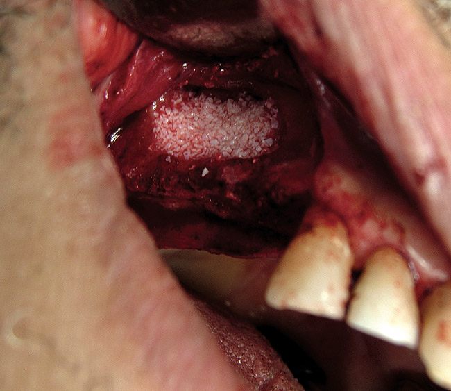 The type of graft material and its effect on the success of the implants has been examined by many authors. In early studies, the autogenous bone graft was considered the gold standard.5,6 Froum et a24 found that when as little as 20% of autogenous bone was added to the bone substitutes, xenografts alone or in combination with autogenous bone and/or demineralized freeze-dried bone allografts (DFDBA) had statistically significant increases in vital bone formation The mean vital bone formation was 27.1% after healing for 6 to 9 months. Many authors have reported higher survival rates for implants placed into sinuses grafted with 100% xenograft as compared to those placed in sinuses grafted with 100% autogenous bone or composite graft xenograft and autogenous bone.25-27 Every bone grafting material has been used for sinus augmentation: DFDBA particulate,28 anorganic bovine bone particulate,24 nonresorbable hydroxyapatite,29 autogenous block grafts,30 rhBMP-2 collagen sponge,31 and tricalcium phosphate6 (Figure 6).