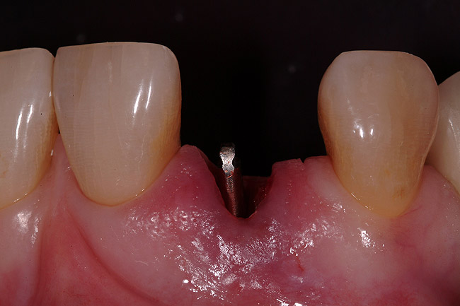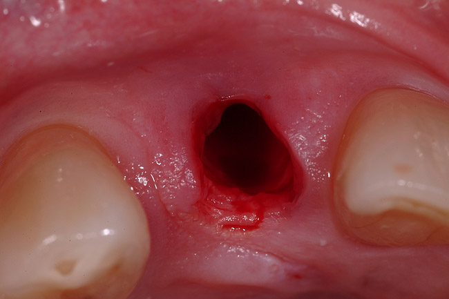 A 54-year-old, non-smoking woman presented with a root fracture at the maxillary right lateral incisor (Figure 1). The patient presented with a 10-mm pocket at the mid-facial probing depth, and a Grade 2 mobility. The preoperative peri-apical digital radiograph can be seen in Figure 2. A natural diastema existed on the distal aspect of the right maxillary incisor, and the patient did not wish to have this corrected. To hold the natural tissue emergence profiles throughout the treatment phase, the immediate implant placement and provisionalization procedure was chosen to treat the affected site. Before the procedure, an occlusal index and registration was taken so that when the retrofitting of the natural tooth shell was accomplished, the exact location of the natural tooth shell could be seated on the implant abutment at the time of implant placement (Figure 3). After administration of an appropriate local anesthetic, tooth No. 7 was removed by an atraumatic technique to preserve the natural soft tissue emergence profiles present pre-surgically (Figure 4). After tooth removal, debridement of the extraction socket was accomplished by curettage of the socket, followed by rotary instrumentation with a course #8 round diamond to ensure removal of all remnants of the periodontal ligament, granulation tissue, and localized debris. To aid in the debridement, the patient was started on a preoperative administration of Augmentin 875 mg, taken the day before treatment, and once again 1 hour before the surgical visit. The patient then continued this antibiotic course for a total of 10 days.