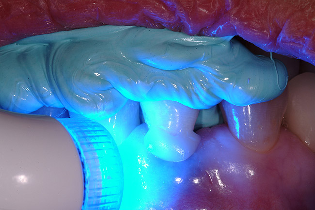 The natural tooth root was removed from the extracted right maxillary lateral incisor. The crown portion of the tooth was hollowed out, following the flow of the cemento-enamel junction of the tooth shell. The tooth shell was then acid-etched, and bonding agent was applied to the inside of the shell. A provisional coping, ZocProv 3® (Zimmer Dental) was roughened, and a bonding agent was applied to the outside surface and placed over the abutment portion of the one-piece implant intraorally. The tooth shell was then placed into the bite registration (Figure 9). The shell was filled with regular composite (Figure 10), and placed over the provisional coping, intraorally, and the complex was light-cured (Figure 11).