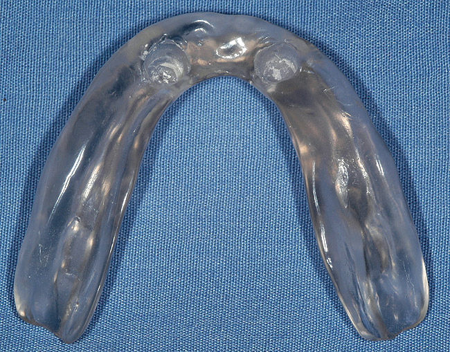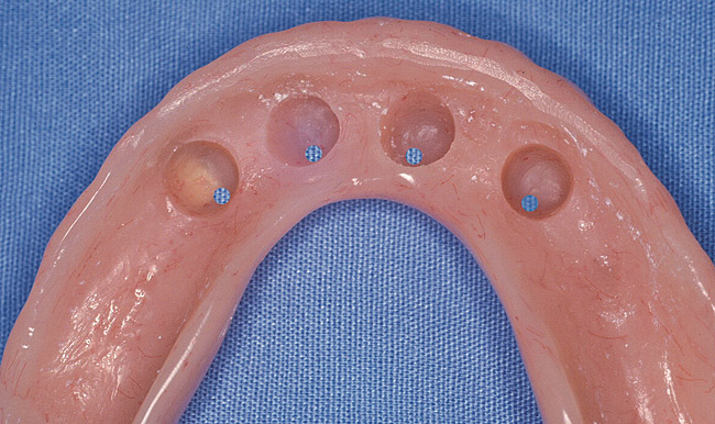 Any successful overdenture treatment begins with the understanding that conventional full-denture fabrication principles must be followed. These include ideal border adaptation and extension and full-denture occlusion.10 Through proper articulation and denture tooth setup, all parameters of final treatment success can be evaluated. A try-in of the proposed tooth setup will allow evaluation of esthetics, phonetics, and support, as well as the critical determination of ridge position relative to the proposed prosthesis before surgery. The setup then will be used to guide ideal implant position because the most critical factor in overdenture implant placement is that implants emerge well within the confines of the denture.