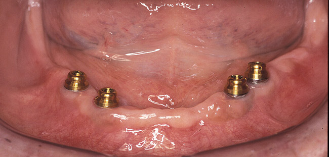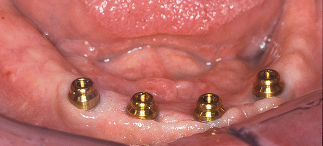 Still, the majority of patients will greatly benefit from two to four nonsplinted mandibular implants to provide ideal retention and some level of occlusal support. Numerous studies have shown equal outcomes in long-term implant survival in mandibular overdentures regardless of splinting.13 Many factors prove overwhelmingly in favor of individual nonsplinted implants, such as decreased cost, decreased space requirement inside the denture, and improved access for hygiene. The individual nonsplinted approach provides the most ideal outcome with the greatest cost-effectiveness and greatest efficacy of treatment for the majority of edentulous patients.
