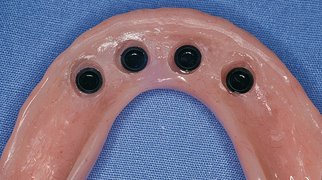 There are several attachments available to provide retention of the prosthesis to the implants. Numerous studies have shown that many designs work well. However, to provide a guide to attachment selection, a number of factors should be considered. All attachments are either rigid or resilient. Rigid attachments restrict rotational movement and provide only a limited path of off-angle insertion, while resilient attachments allow varying amounts of rotation and angulation correction. In situations where implants are even minimally nonparallel, a resilient attachment will consistently show less friction, wear, and breakage. Considering that patients frequently bite appliances into place, this resiliency also will prevent premature wear and breakage. Clearly the major overdenture complication and maintenance concern relates to attachment adjustment and replacement,14,15 as well as fracture from the prosthesis. These issues can be significantly minimized through proper attachment selection and use of resilient attachments.16 A resilient connection between the denture and implants should allow reduced loading of the abutments in so far as the degree of movement takes into account the compressibility (ie, resilience) of the mucosa. The greatest portion of the occlusal forces are thus absorbed directly by the alveolar ridges.17 There are attachment systems that allow angulation correction of up to 20° per implant (40° for two divergent implants) within a resilient range (LOCATOR¬Æ, Zest Anchors, Escondido, CA).