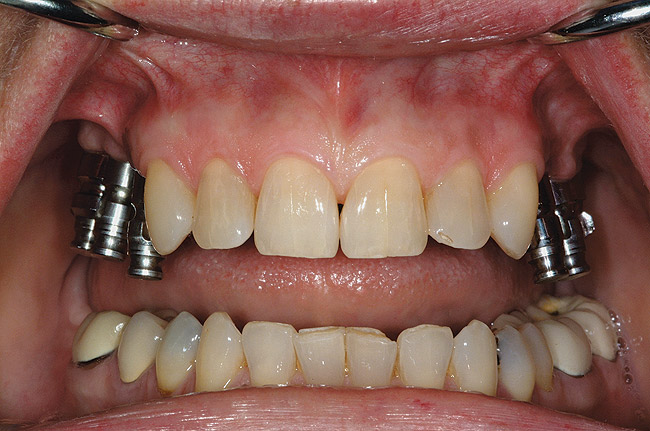 Restoration of partially edentulous patients with dental implants has not only added a new opportunity for replacement of missing teeth but also presented a different set of challenges for providing successful, long-term dental prostheses. Initially, many treatment protocols that were followed for the completely edentulous patient proved to be less than ideal for the partially edentulous patient.15 Combining natural teeth and dental implants in the same arch, sometimes in the same quadrant, creates a biomechanical difference between teeth and implant(s) during function. Traditional three-unit fixed partial dentures (FPDs) placed on two dental implants can be successful. Yet when forces of occlusion are high, the need to place one implant per tooth or three implants to support four units in the posterior quadrants is often recommended.8,15 Moreover, blending natural teeth and bony/gingival contours with the edentulous spaces being restored with implants can be difficult in meeting the patient's expectations and can potentially create difficulty with oral hygiene access.
