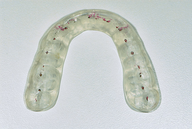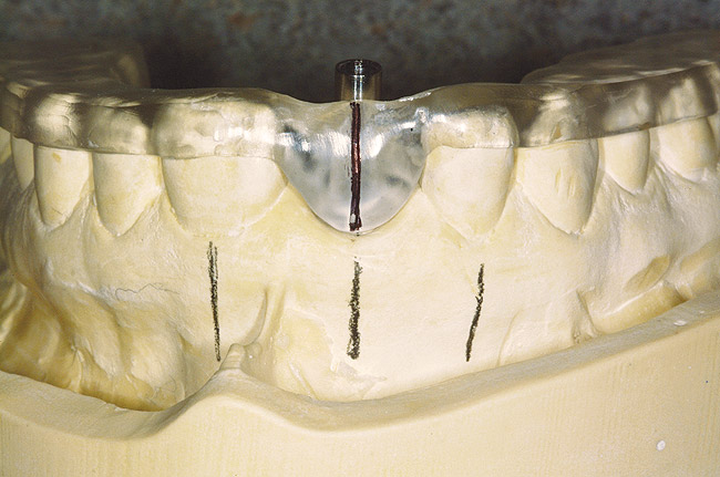 Another concern for loading of dental implants is implant alignment. When placing implants for the edentulous patient and an overlay or hybrid restoration is planned, the implants should then be placed as parallel as possible and slightly lingual to the actual tooth position. This allows establishment of normal contours of the prostheses and space for placement of the prosthetic teeth. Implants should not be placed in the central incisor region for a maxillary overlay prosthesis because this will compromise palatal contours, thereby affecting speech and tongue function. If, however, implants are planned for the partially edentulous patient and the replacement is for a natural tooth or teeth, then implants should be placed more in line with the long axis of the natural root. Teeth are designed to better handle the multitude of directional loads encountered during mastication when properly aligned on their bony base. Implants placed more in line with natural tooth roots that are properly positioned on their bony base may allow implants to better endure the various functional loads while promoting the continual physiologic bone remodeling necessary for long-term implant survival (Figure 6 and Figure 7 ). Depending on the type of anticipated function and the presence or signs of parafunctional habits, use of a maxillary biteplane/nightguard may be indicated (Figure 8). This can reduce the possibility of lateral loads, which have a detrimental effect on the dental implant(s). The biteplane is adjusted in centric relation with simultaneous occlusal contacts and shallow anterior guidance.