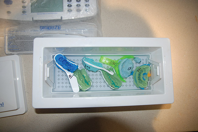 The first step in any infection control procedure is cleaning. With regard to dental laboratories, impressions may be cleaned by scrubbing gently and rinsing to reduce bioburden, and subsequently disinfected with an antimicrobial agent (Figure 8).10 Dental impressions may be disinfected by spraying, dipping, or immersing. The advantages of the spray method are that less of the disinfectant product is used, and often the same product may be used to disinfect environmental surfaces. However, the spray method may not be as effective as immersion due to the potential for pooling of the disinfectant in some areas, while other areas may remain dry secondary to undercuts in the impression. The spray method also releases chemicals into the air, increasing the potential for occupational exposures. The dipping or immersion technique requires complete coverage of the impression in the disinfectant. Shorter exposure times minimize possible distortion and deterioration of the surface quality of the resulting stone casts. However, the manufacturer's instructions should always be consulted for their recommended procedures.