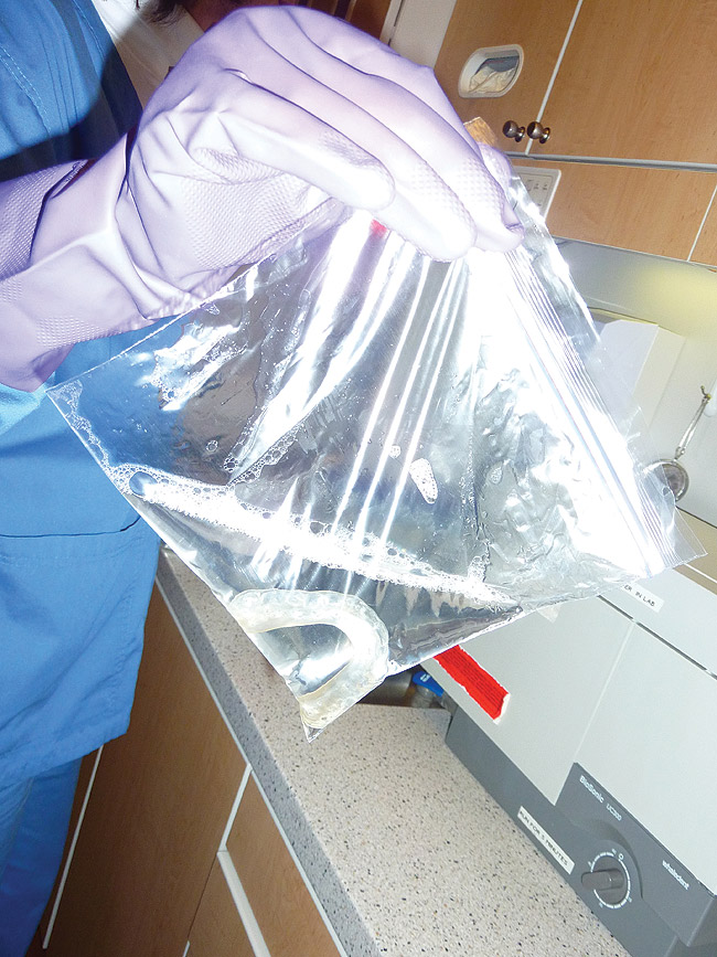 Contaminated prostheses should also be disinfected prior to being worked on in the dental laboratory. The prosthesis should be scrubbed with a brush using an antimicrobial soap to remove debris. If there is calculus adherent to the prosthesis, it should be placed in a sealed plastic bag or beaker filled with ultrasonic cleaning solution or calculus remover, and placed in the ultrasonic cleaner for the required time (Figure 9). The ultrasonic unit should be covered to reduce splashes and spatter, followed by cleaning in a detergent and then appropriate disinfection. After rinsing and drying, it is safe to continue performing laboratory work on the prosthesis.