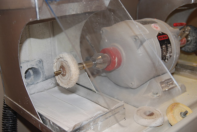 The lathe in a dental laboratory presents unique safety and infection control risks. When using a lathe, dental technicians must wear protective eyewear. In addition, a Plexiglas® shield should be in position and the vacuum should be activated (Figure 10). The optimal pumice solution is made by adding surfactant soap and possibly a disinfectant solution to the mix. The pumice solution should be changed daily or more frequently if contaminated. All brushes, rag wheels, other laboratory tools, and the lathe should be cleaned and sterilized daily.