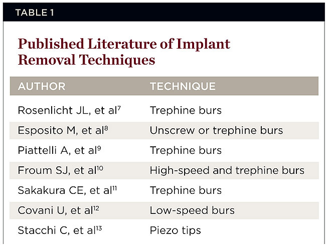 Factors necessary for successful integration of dental implants have been proposed.3 Of these, a lack of mobility is a primary prerequisite. However, even when implants are nonmobile, indications for their removal may exist, such as fracture, malposition, infection, pain, and advanced peri-implantitis.4 Although several reviews of the literature cite various techniques to treat implants with peri-implantitis without removal, these techniques appear unpredictable.5,6 In cases of advanced peri-implantitis or implant fracture, removal of the affected implant is usually necessary. Many of these nonmobile implants require surgical intervention for their removal. Methods of implant removal include use of counter-torque ratchet, piezo tips, high-speed burs, elevators, forceps, and trephine burs. Oftentimes, these instruments are used alone or in combination depending on the clinical situation. There is, however, a paucity of published literature on the subject of implant removal techniques, their indications, drawbacks, and possible complications.